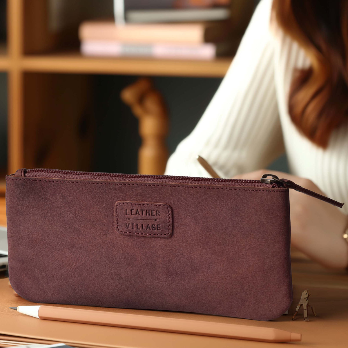 Leather Pencil Pouch & Pen Case is crafted from premium genuine leather with a sleek Fuchsia finish. Featuring a practical double-pocket design and smooth zipper closure, it keeps pens, pencils, and small essentials neatly organized. Compact yet spacious at 8” × 4”, this elegant pouch is ideal for artists, professionals, students, and everyday use by both men and women.
